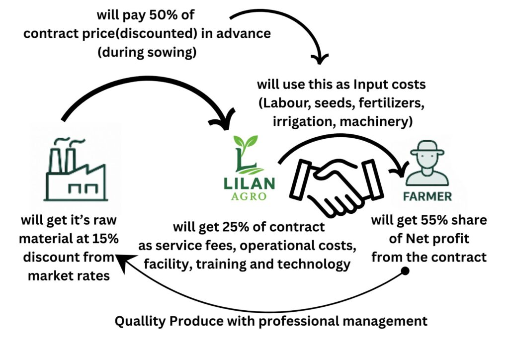 This structure ensures that both ends of the agricultural chain — farmers and industries — operate in harmony, with shared profits, shared responsibility, and shared success.